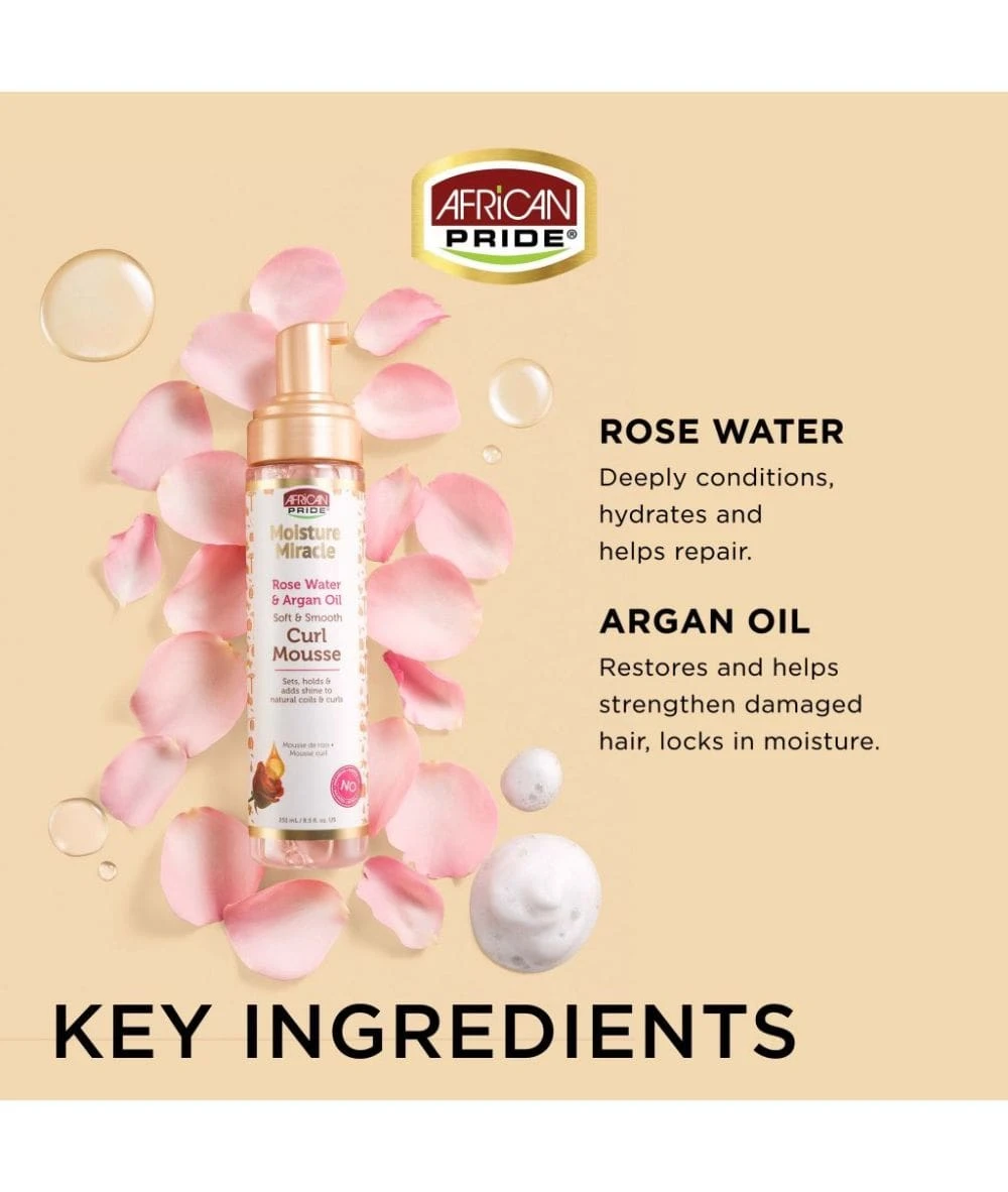 African Pride Moisture Miracle Rose Water & Argan Oil Curl Mousse is a lightweight foam blend of rose water and argan oil made to condition hair while adding body, control and a flexible hold. Leaves natural styles defined, frizz-free and soft.