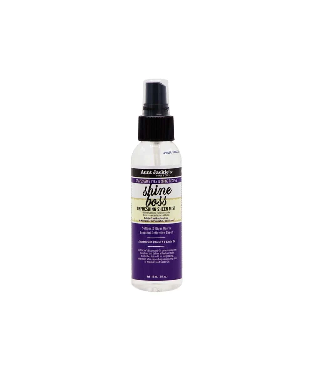 Enhance your curls with the luminous shine of Aunt Jackie”s Grapeseed Shine Boss Refreshing Sheen Mist your go-to for soft, frizz-free, and beautifully radiant hair!