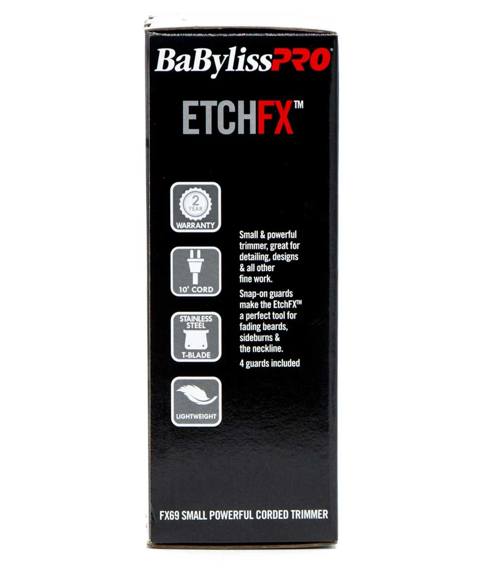 The EtchFX trimmer is small and powerful, great for detailing, designs and other fine work. Snap-on guards make it a perfect tool for fading beards, sideburns and neckline, too! Four guards included.