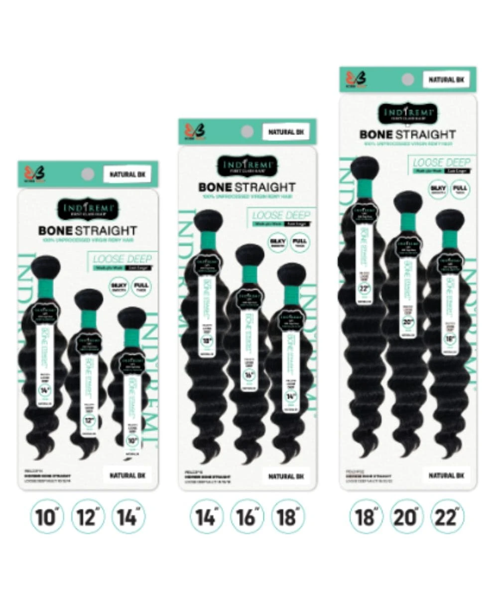 Elevate your style with the Bobbi Boss Indiremi Bone Straight Loose Deep Multi Pack! This exquisite hair extension pack features premium, high-quality Indiremi fibers that deliver a natural look and feel. Perfect for creating versatile hairstyles, the Bone Straight texture provides a sleek and polished finish, while the Loose Deep wave adds a touch of effortless volume and bounce.