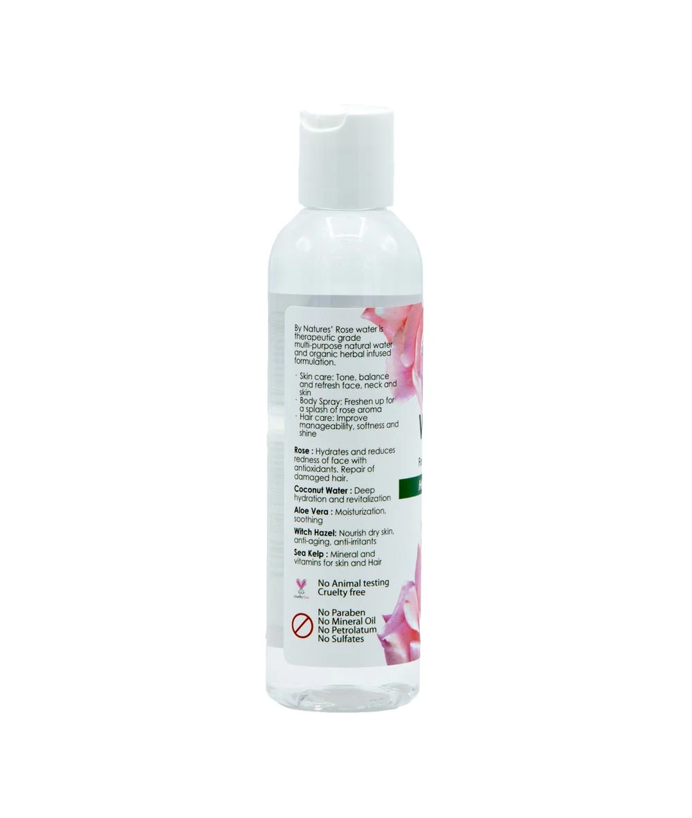 By Natures Rose Water is a refreshing and hydrating mist designed to revitalize and rejuvenate the skin and hair. Infused with pure rose water, this multi-purpose formula helps maintain moisture balance, soothe irritation, and promote a healthy glow. Perfect for all skin and hair types, it provides a lightweight, refreshing boost anytime your skin or hair needs hydration.
