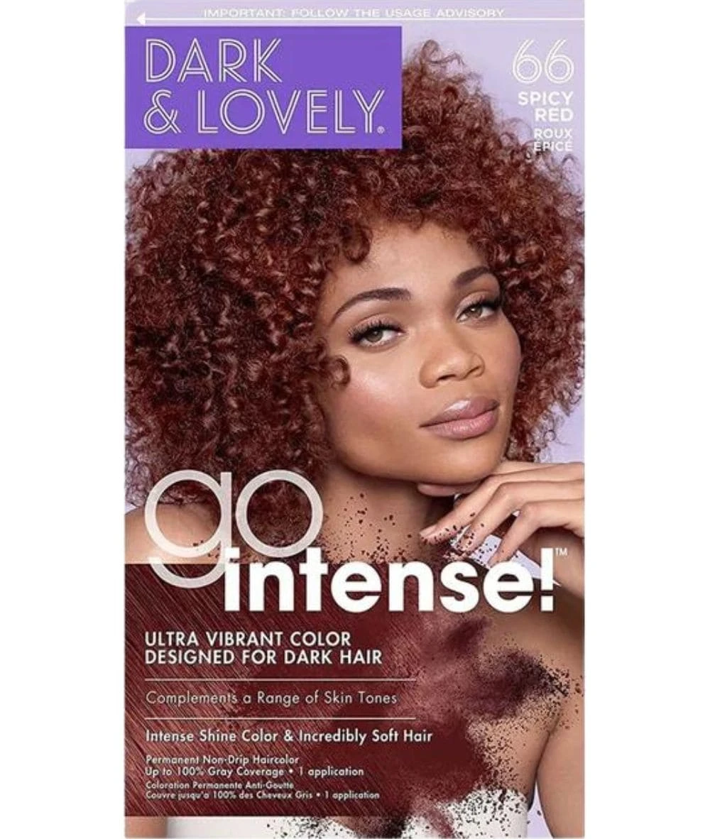 Dark and Lovely Go Intense is an intensifying permanent hair color tailor made for you. Perfectly balanced color dyes deliver intense color on dark hair. Nourishes with moisture as it colors for ultra smooth, shiny, soft hair. Non-drip crème gel spreads evenly on all hair textures from natural to relaxed.