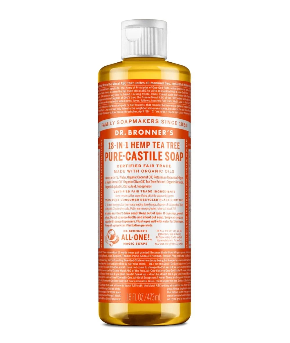 Woodsy and medicinal, our Tea Tree Pure-Castile Liquid Soap contains pure tea tree oil—good for acne-prone skin and dandruff! Dr. Bronner”s soap is concentrated, versatile and effective. Made with organic and certified fair trade ingredients. Organic hemp seed oil is now sourced in the U.S. following hemp legalization! Packaged in a 100% post-consumer recycled bottle. All-One!