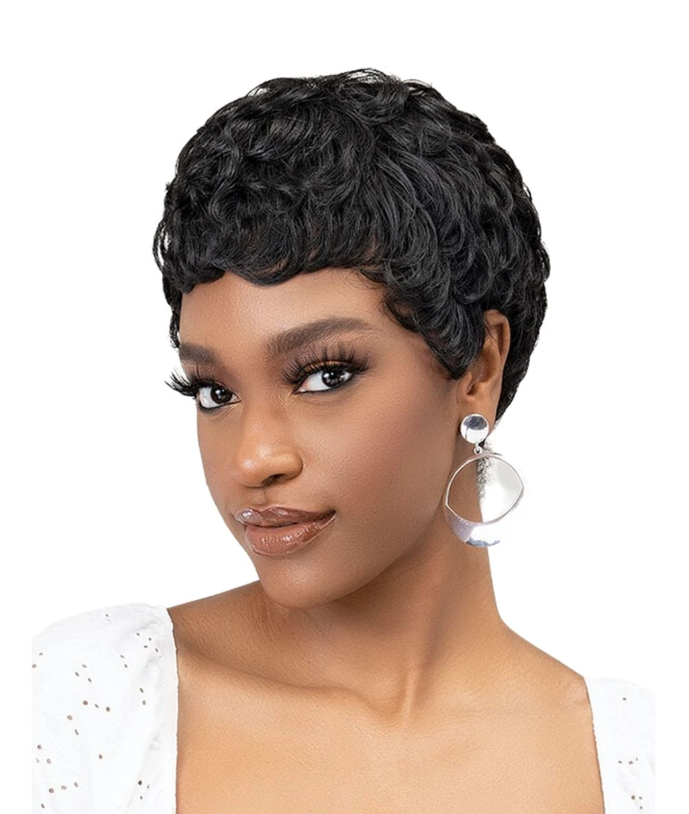 The Janet Collection MyBelle Kyomi wig offers a chic 8-inch curly pixie style crafted from premium heat-resistant synthetic fiber. Designed for comfort and style, this full-cap wig features a fixed parting and a breathable mesh cap, making it ideal for daily wear.
