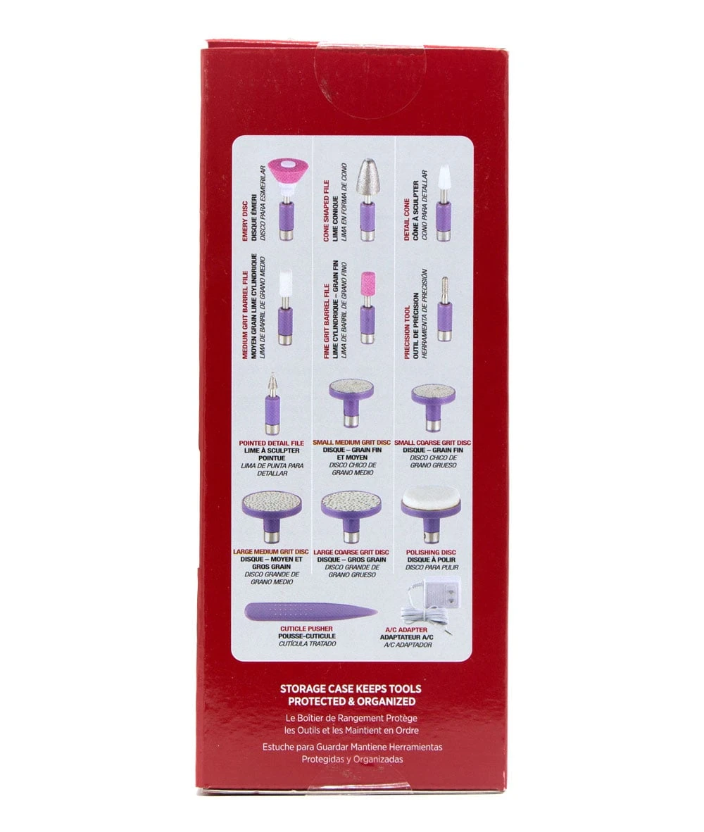 12 interchangeable attachments to shape, clean. polish nails and soften skin