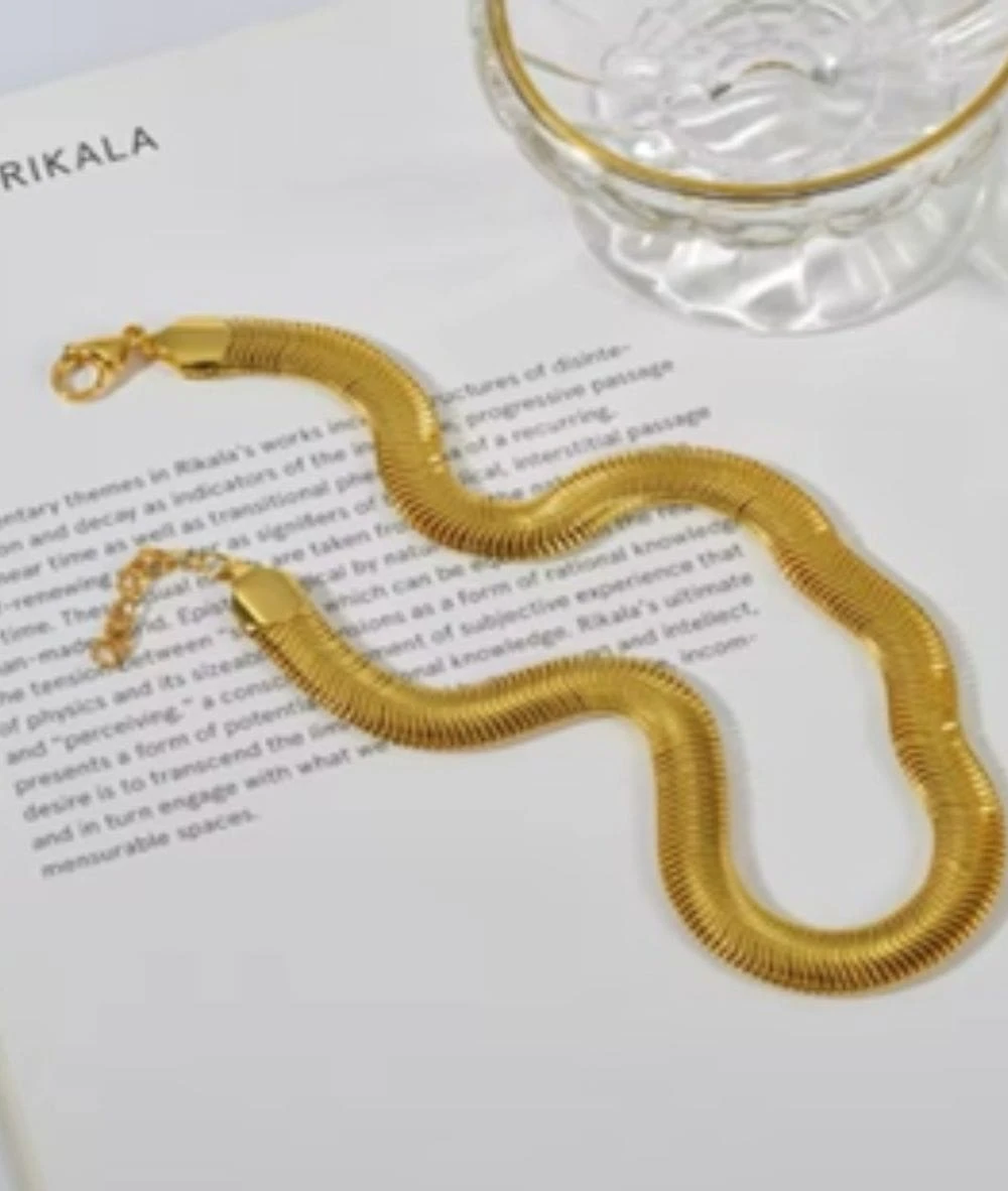 Make a bold yet refined statement with the Nude Rose Stainless Steel 18K Gold Plated Herringbone Snake Necklace. Featuring a unique herringbone design, this necklace combines the sleek texture of a snake chain with the intricate elegance of herringbone patterning. Plated in luxurious 18K gold, the necklace offers a polished, radiant shine that adds sophistication to any outfit.