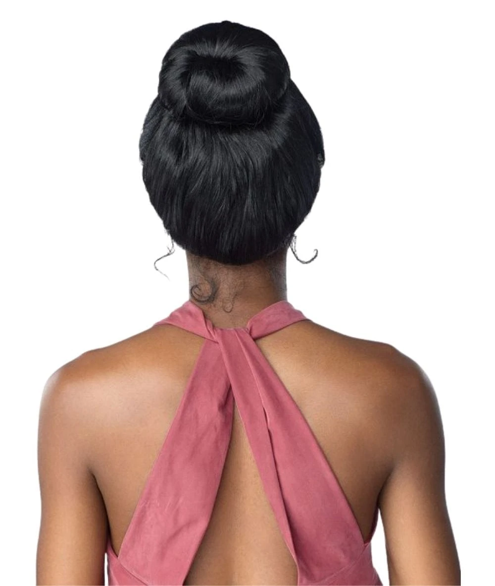 Style down into waves or wear in the pre-tied high bun—or alternate as desired.