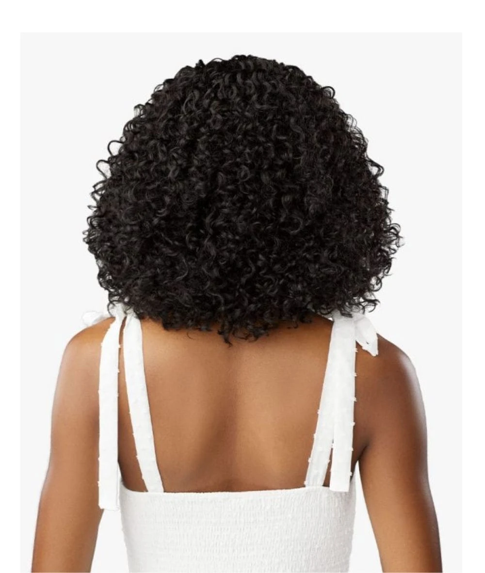 Tight curls that fall over the shoulders with lightly trimmed curly bangs.