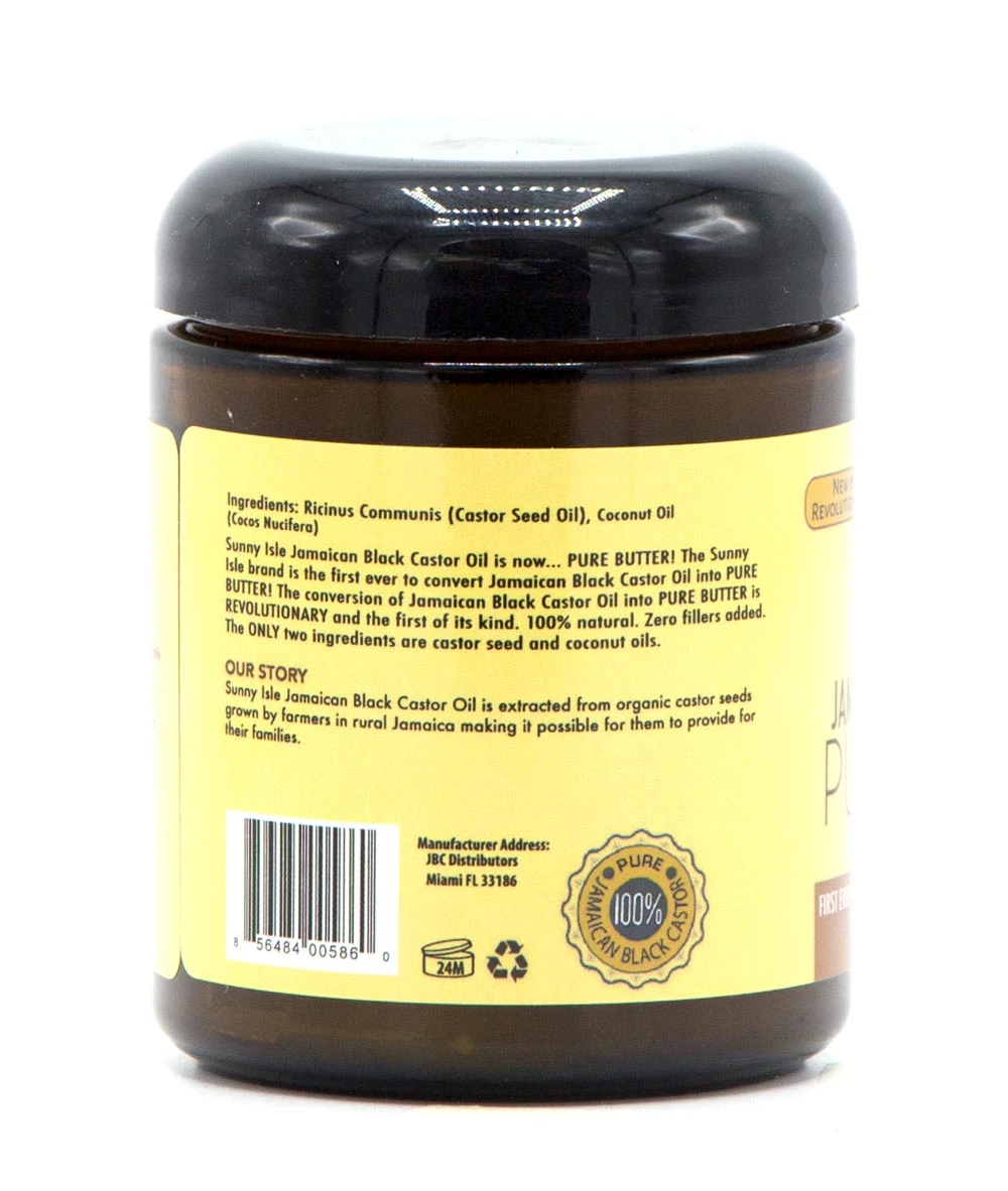Sunny Isle Jamaican Black Castor Oil is now… PURE BUTTER! The Sunny Isle brand is the first ever to convert Jamaican Black Castor Oil into PURE BUTTER! The conversion of Jamaican Black Castor Oil into PURE BUTTER is REVOLUTIONARY and the first of its kind. 100% natural. Zero filters added. The ONLY two ingredients are castor seed and coconut oils.
