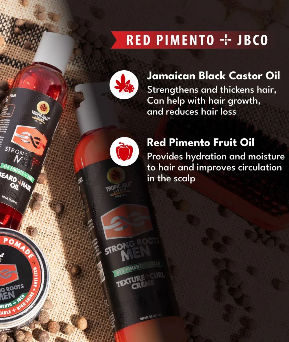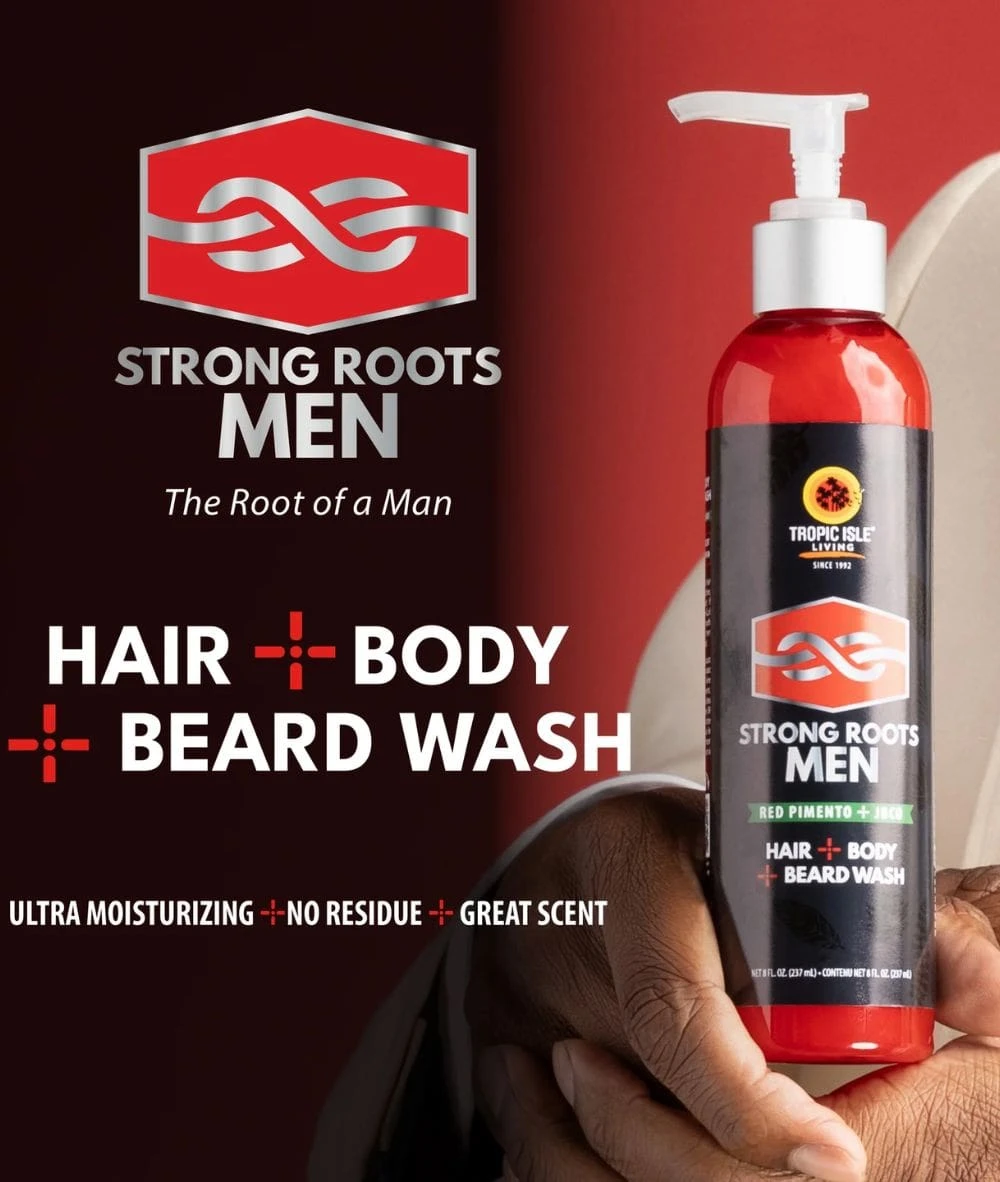 [Plant-based] Strong Roots Men Hair + Body+ Beard Wash is a plant-based gel cleanser that will keep your beard cleansed, hair moisturized, and body soft. [3 in 1] Deep clean your hair, body & beard with our 3-in-1 wash for the ultimate beard and skin care regimen. This wash is tough on dirt, flakes, and odors but soft on strands. [No Chemicals] This 3-in-1 wash is formulated with no parabens, no sulfates, no petrolatum, no silicones, and no animal testing. [JBCO & Red Pimento] Strong Roots Men collection combines Jamaican Black Castor Oil and Red Pimento Fruit Oil. Level up your beard & skin care regimen with our latest innovation in men¡¯s care.HOW TO USE