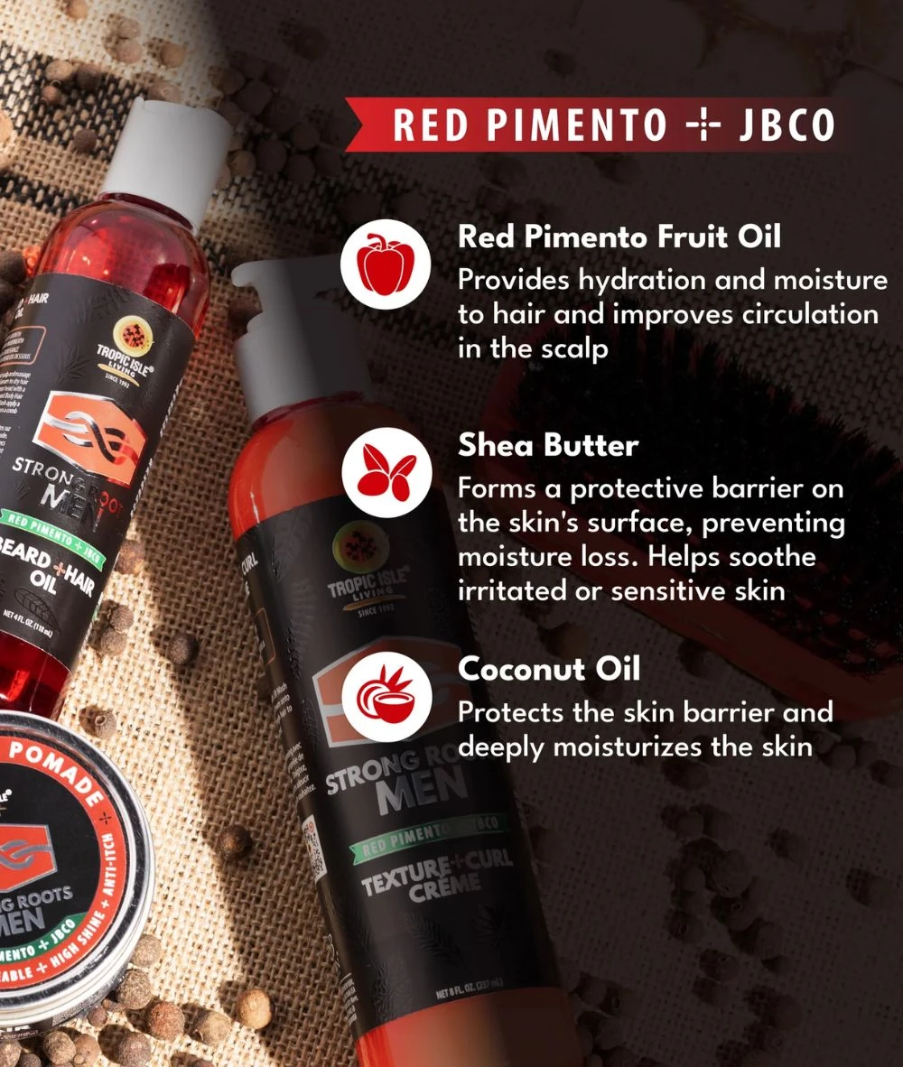 Red Pimento Fruit Oil: Provides hydration and moisture to hair and improves circulation in the scalp.